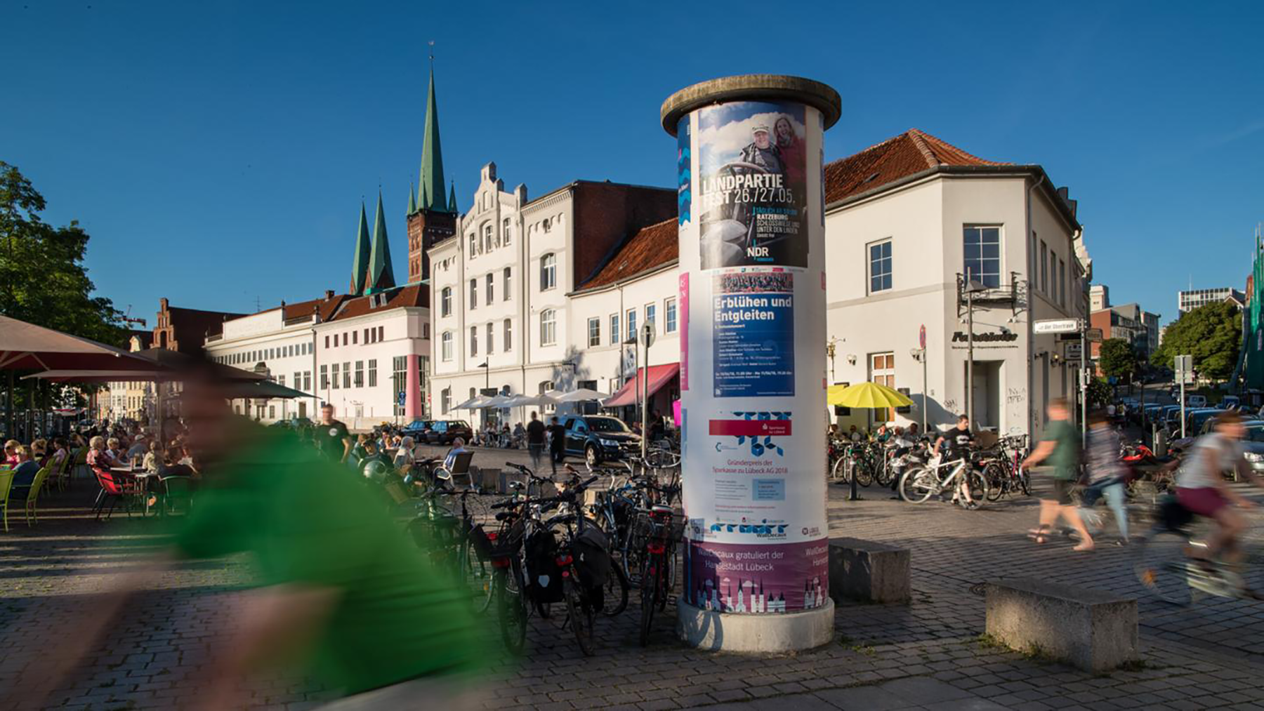 Die klassische Litfaßsäule bietet Raum für mehrere Plakate – zur Information und Reklame. Konzertankündigen, Theater- und Festivalprogramme finden hier eben so Platz wie Werbung für Handel und Freizeit – und das auch für schmale Budgets.